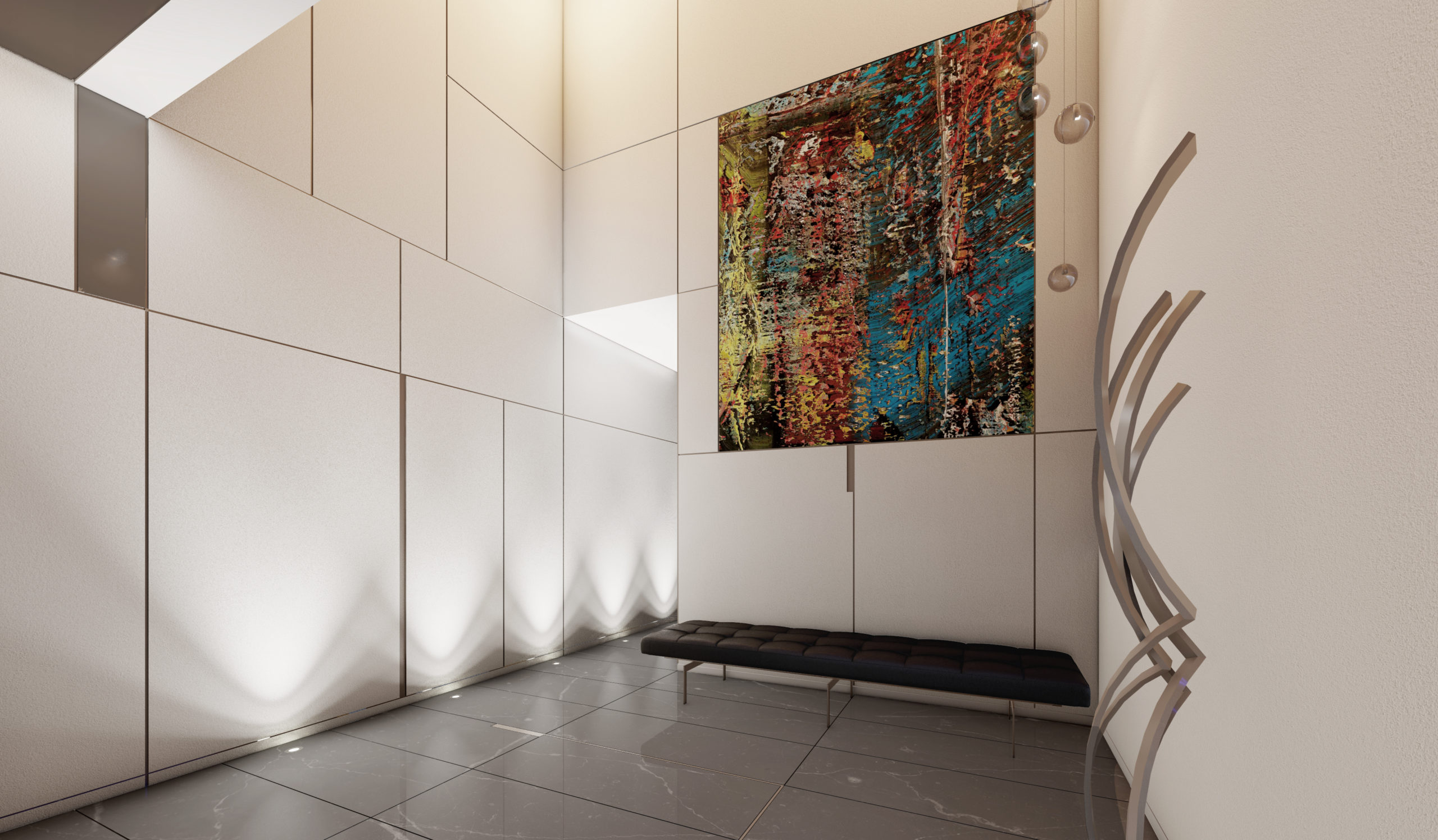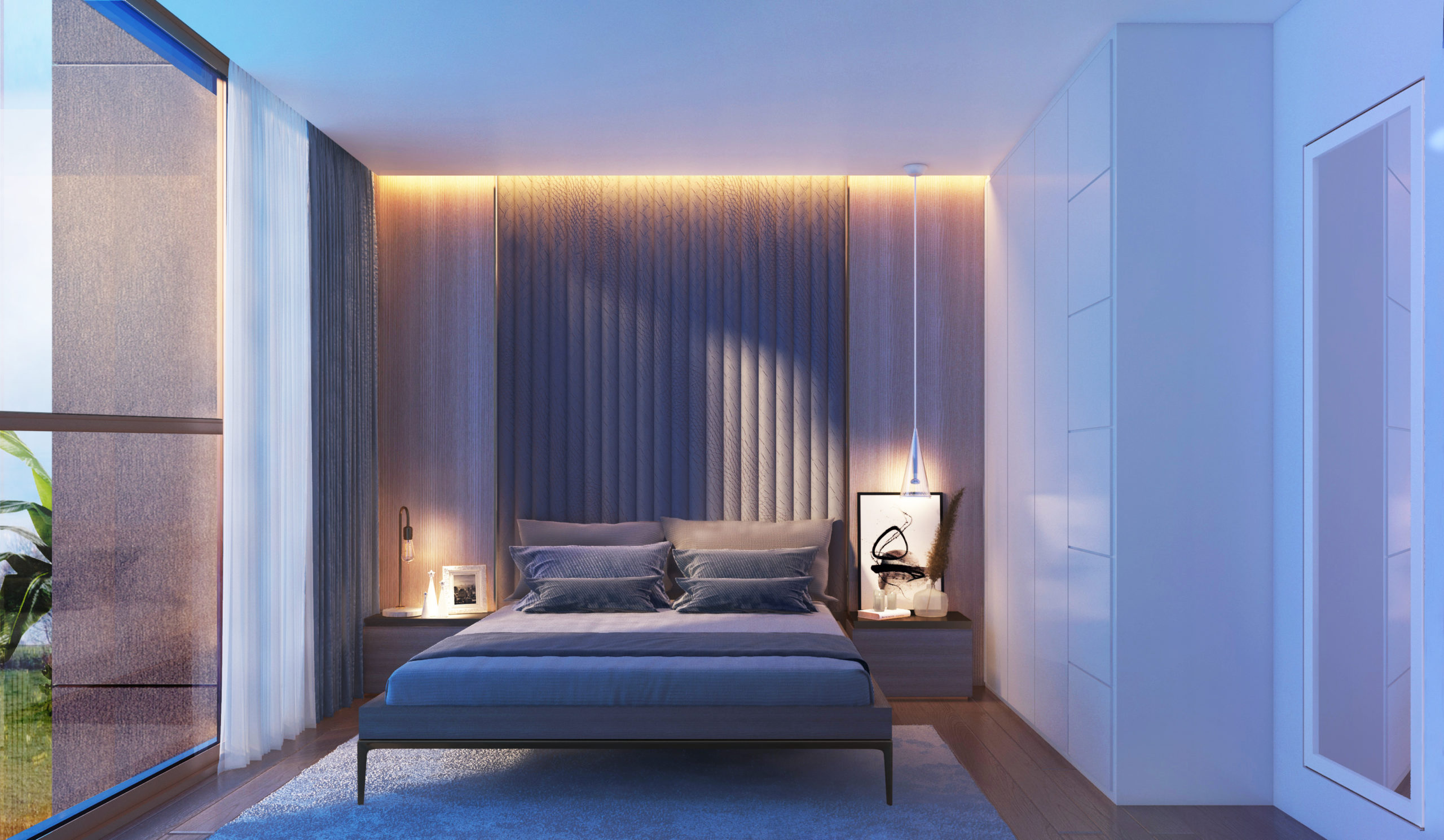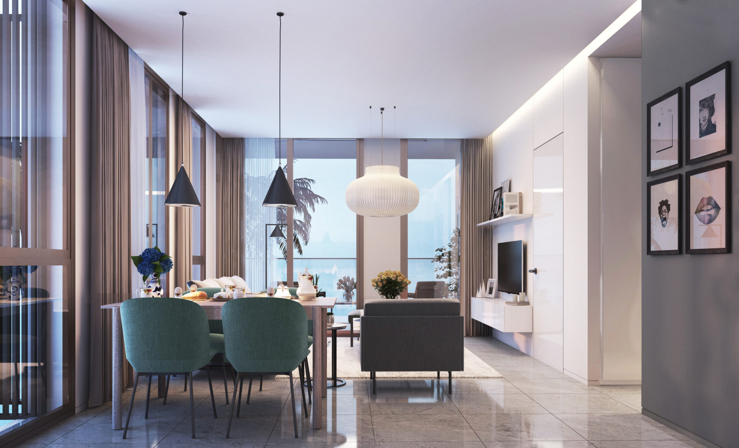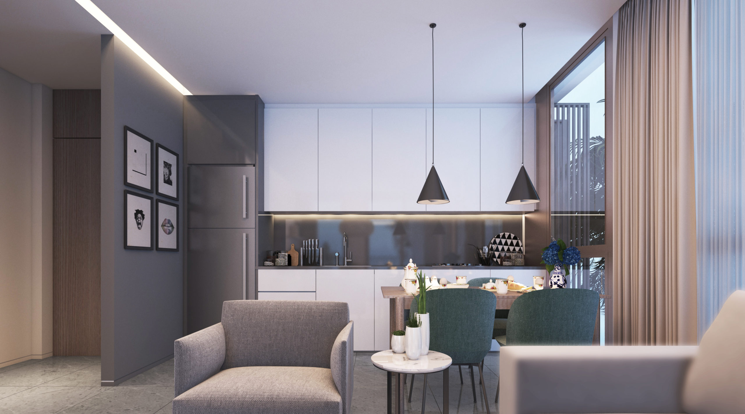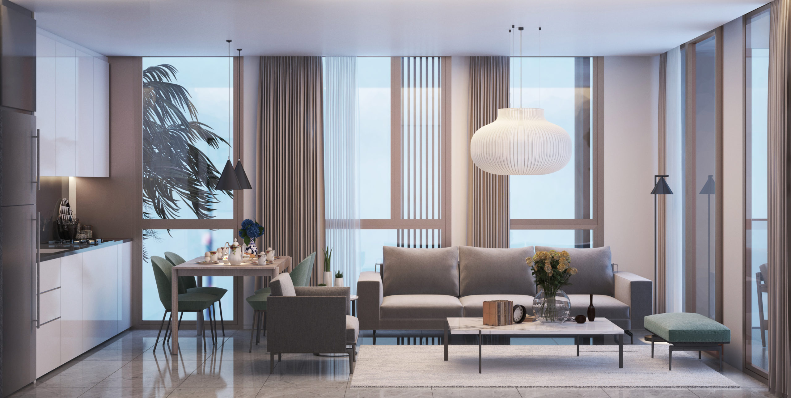Designet udføres i lysegrå farver. Panoramavinduer (110, 165, 110) installeres i lokalerne. Stuen og badeværelserne har porcelæn stentøjsgulv. Soveværelse – laminat.