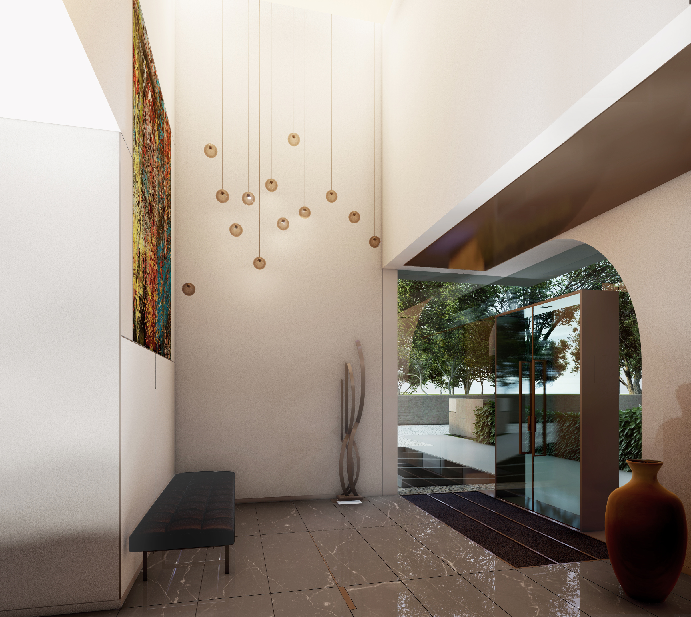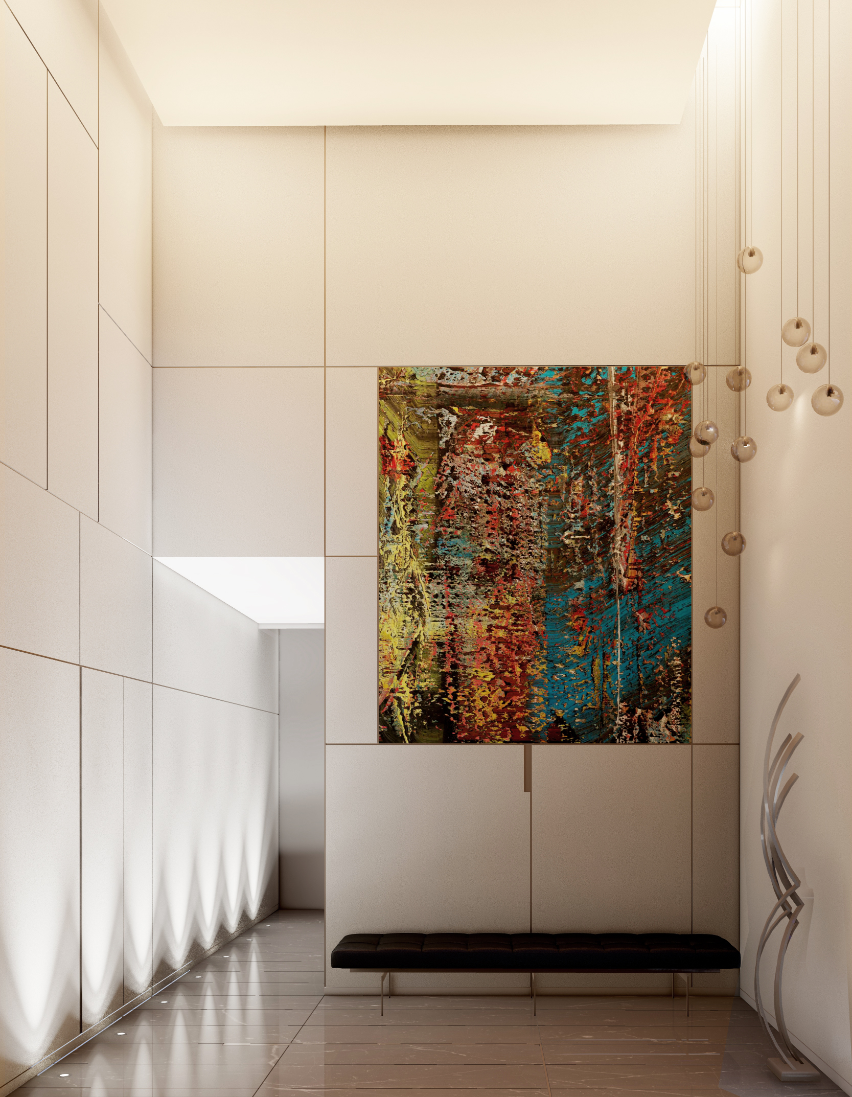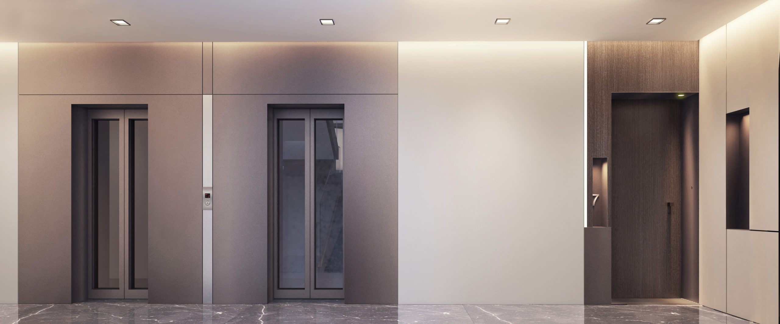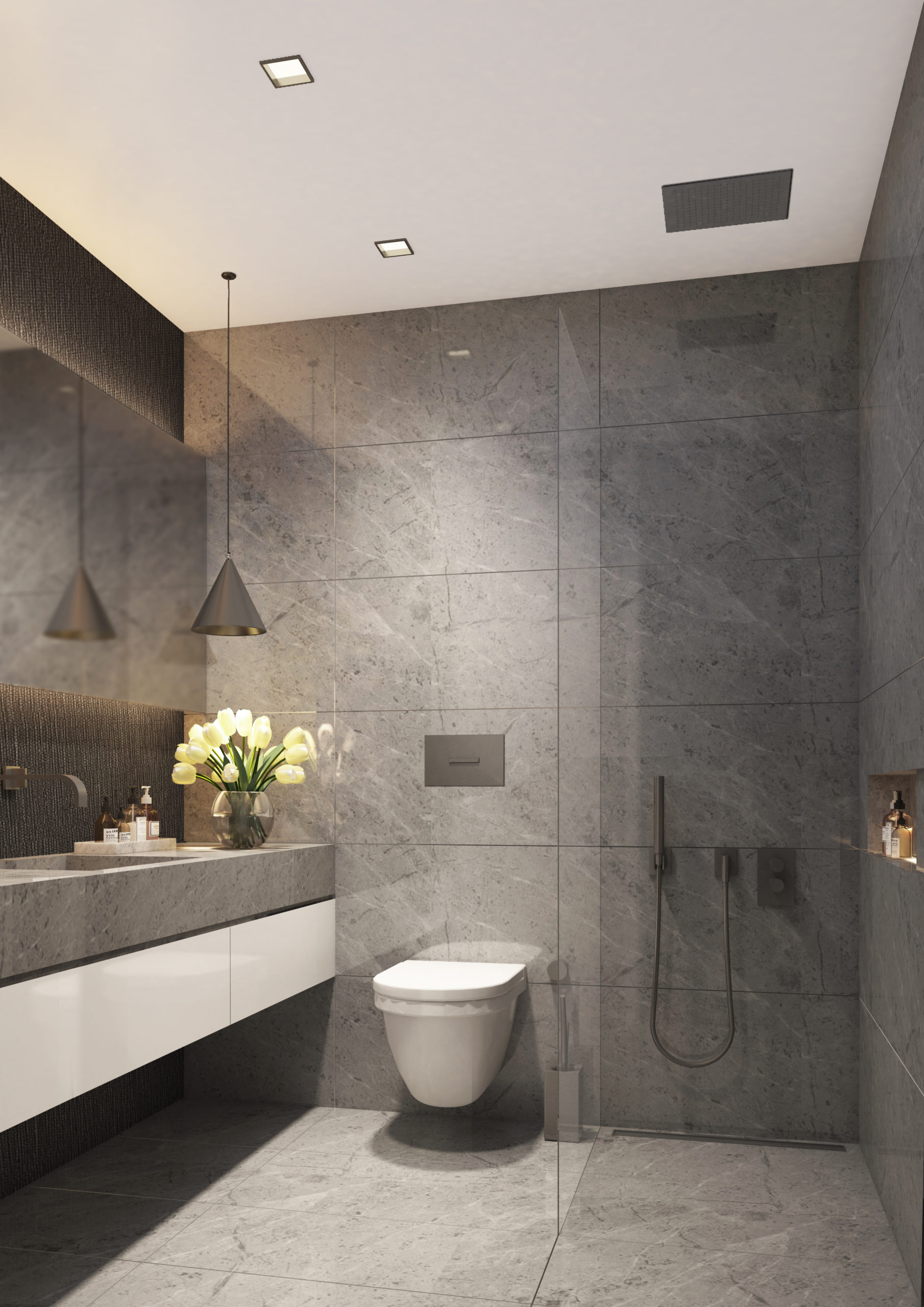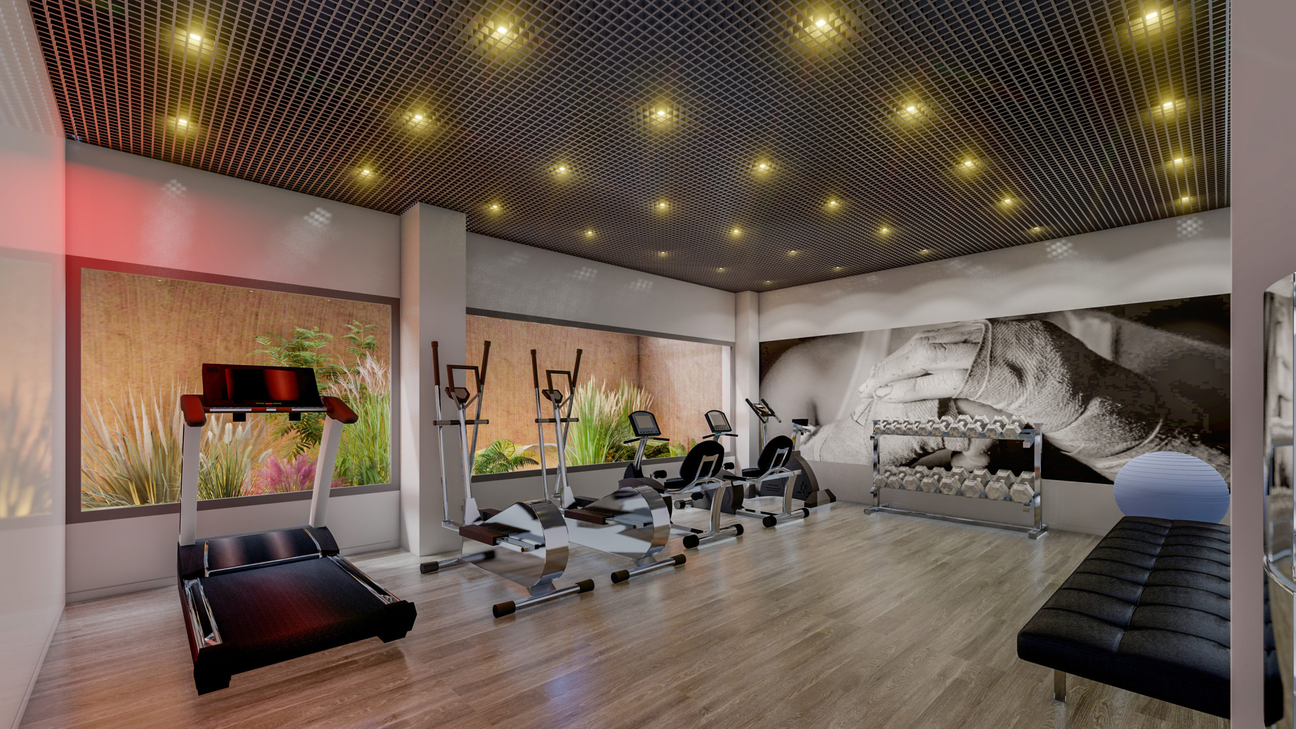 Designet udføres i lysegrå farver. Panoramavinduer (110, 165, 110) installeres i lokalerne. Stuen og badeværelserne har porcelæn stentøjsgulv. Soveværelse – laminat.