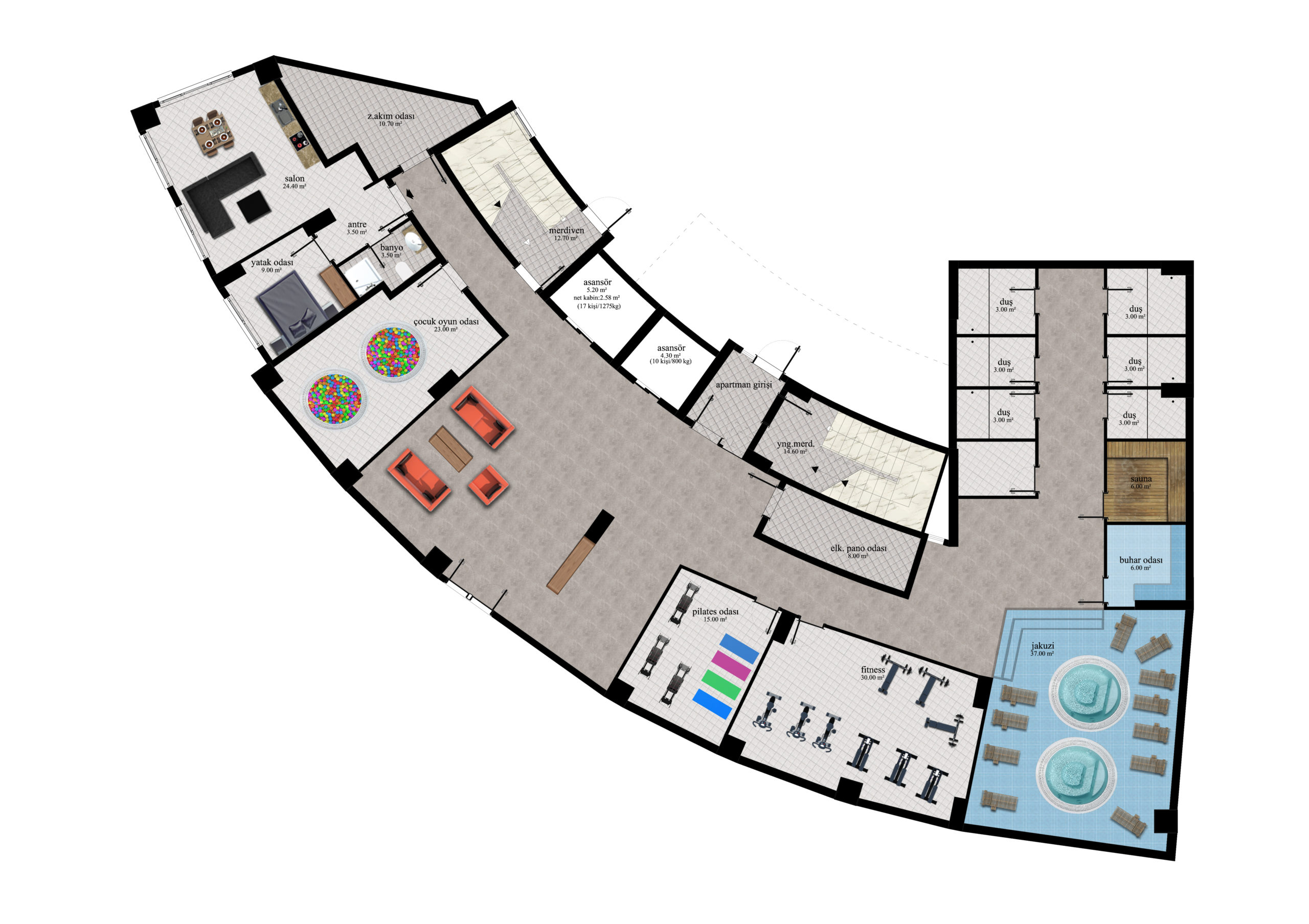 Der er 1 + 1 lejligheder 55 m2, 2 + 1 penthouses 115 m2 og 3 + 1 penthouses 130 m2. Alle lejligheder har indvendig finish og keramiske fliser. Lejlighederne inkluderer en stue kombineret med et køkkenområde (indbygget køkken sæt med en bordplade), et soveværelse, et badeværelse (fuldt udstyret), en rummelig balkon. Det er værd at bemærke de praktiske transportforbindelser med alle områder i Alanya og centrum samt nærhed til lufthavnen kun 35 km.