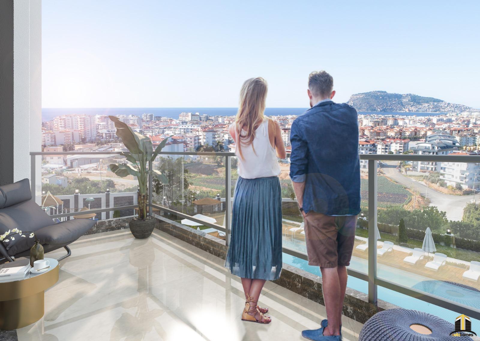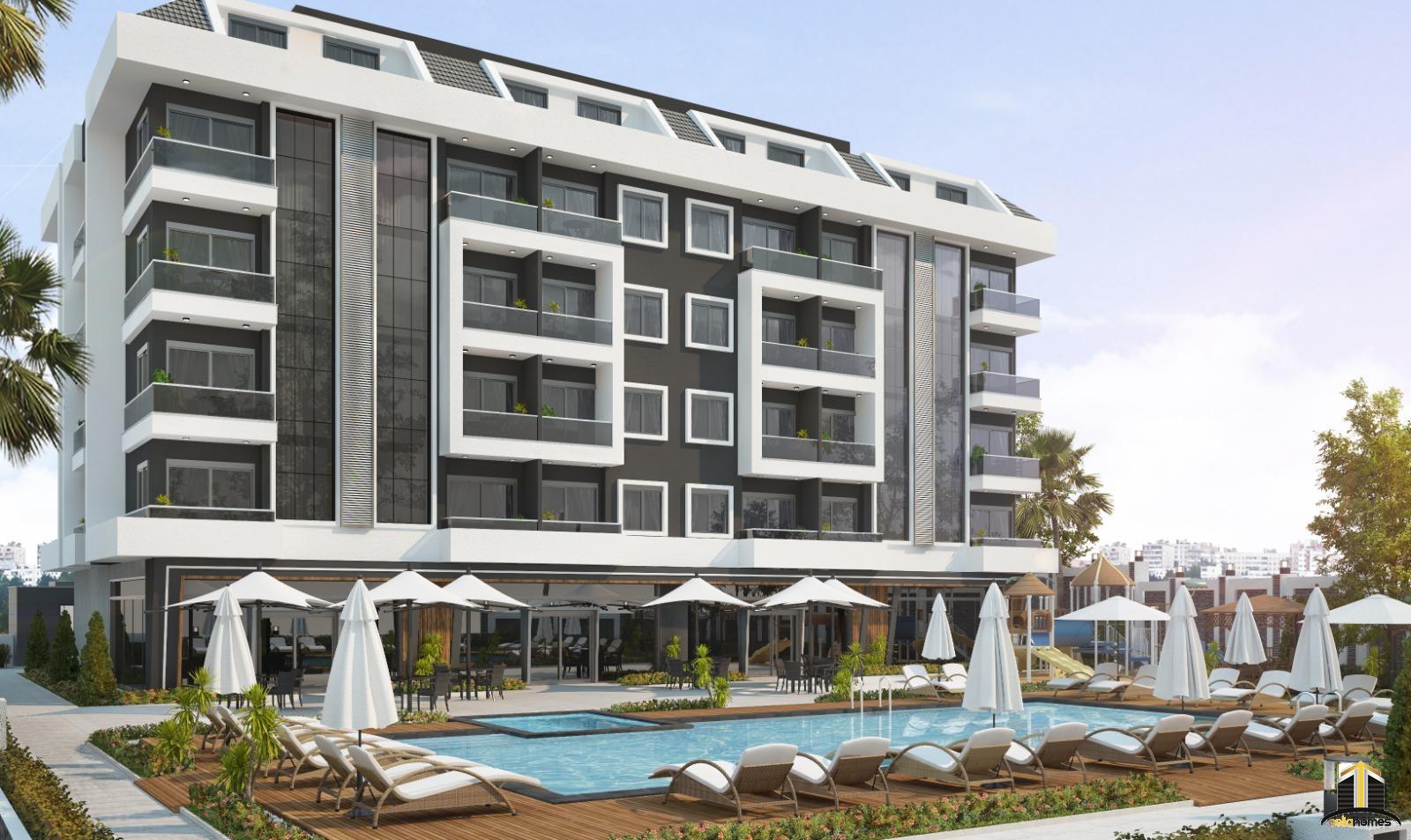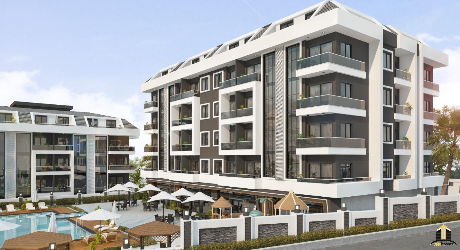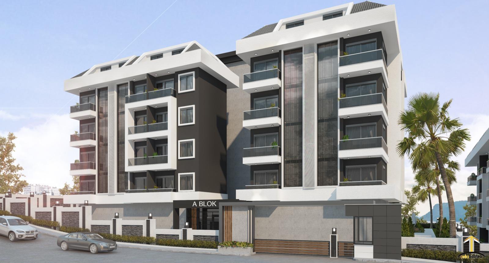Apartments for sale in Alanya are located in a pleasant residential complex found on a land plot of a total of 3907 m2 and consist of 2 blocks with a total of 48 apartments. Each block has 5 floors. Social amenities available in the complex are so: an outdoor and indoor swimming pool with a children area, a Turkish bath, relaxation room, sauna, steam room, massage room, fitness center, pool bar, children’s playroom, game and TV room, and many more. There is a nice and cozy garden with green areas, walking p